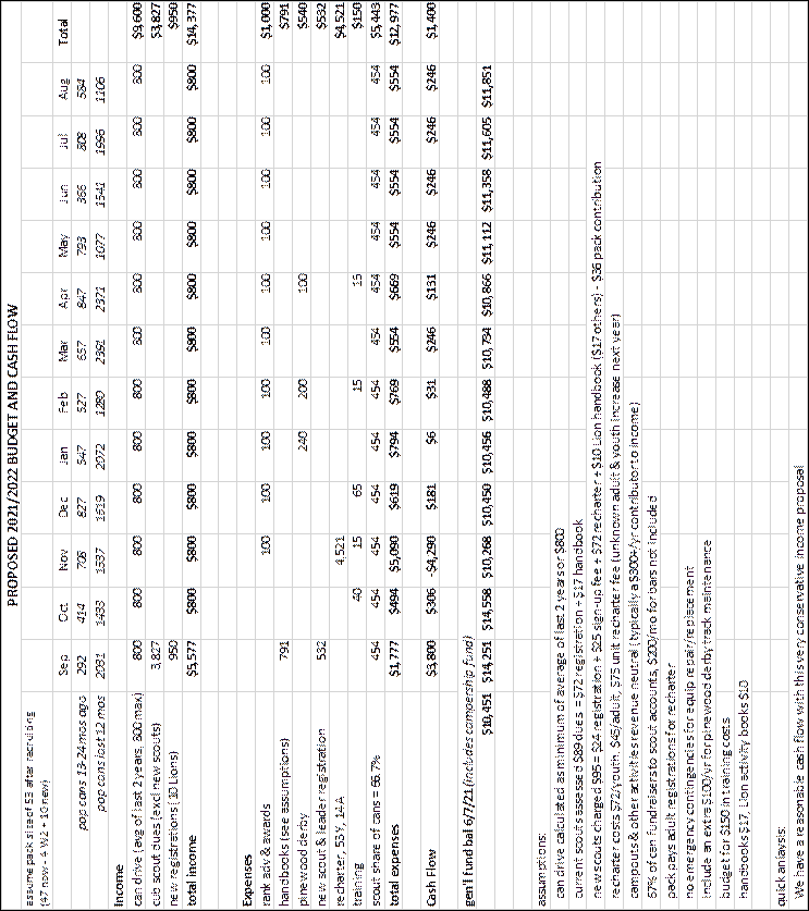 · Proposed budget for Sep 2021 – Aug 2022. The proposed budget follows at the end of these meeting minutes. It assumes a conservative income from the pop can drives while still meting planned expenditures. As the scouts’ share of the pop can drives easily exceeds the cost of rechartering and providing handbooks, the pack will not be subsidizing existing members’ dues this fall. The proposal was reviewed and approved by the group.